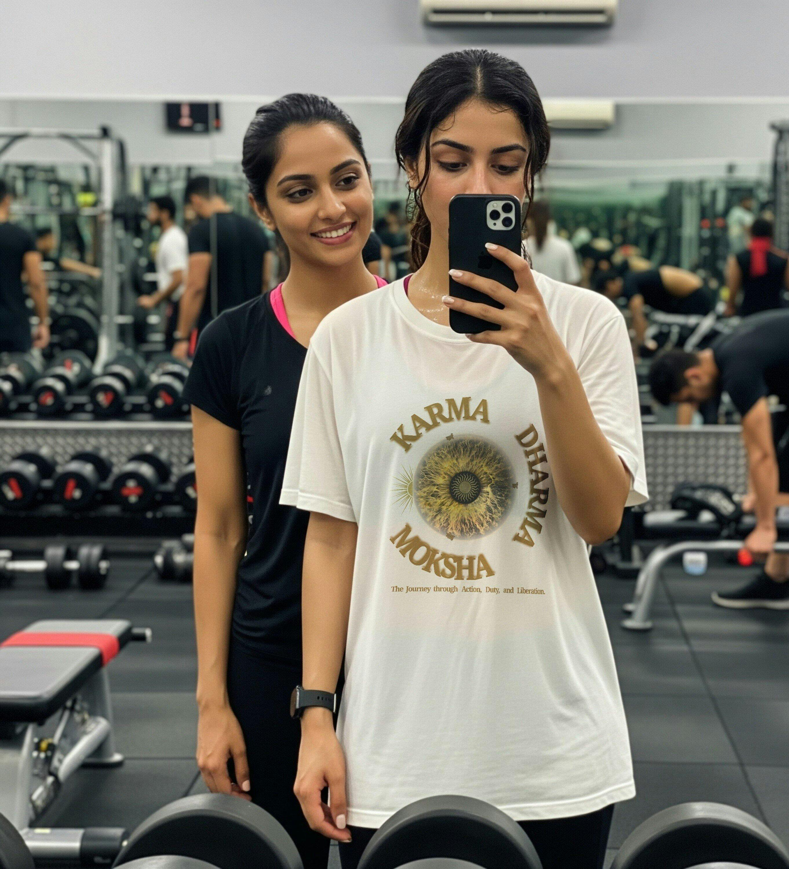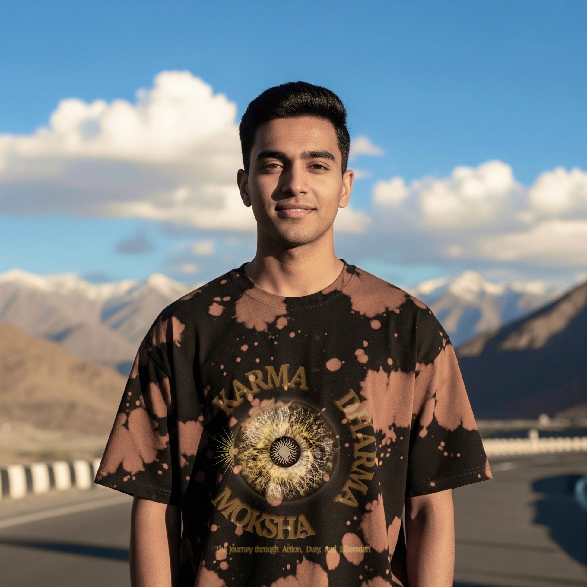 Introducing the Karma → Dharma → Moksha Oversized Tee from The Aum Theory, for those who walk the inner path with bold outer energy.